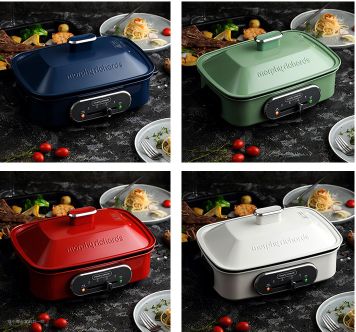 采用的食品级陶瓷油涂层,入口放心有健康保证,耐高温不变色,耐磨防花、防粘,清洗起来特别方便,水一冲就干净了;标配蒸格、煎烤盘、深煮锅,大容量的锅,能满足3-8人使用。