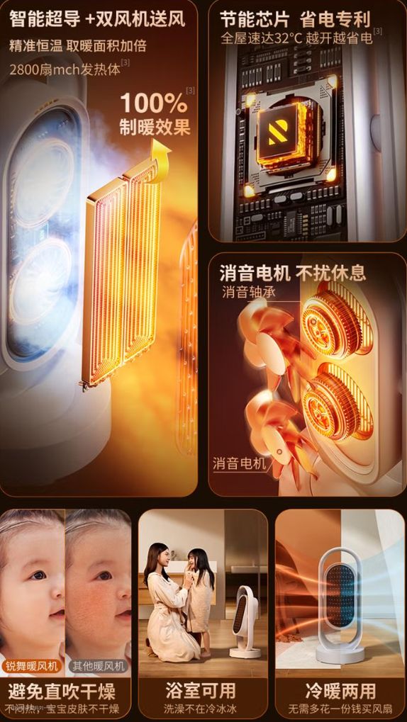 上面说过,锐舞自主研发了多项省电专利,省电效果有国家认证,一秒速热,并且可以旋转送暖风,冷暖两用一年都不闲置,并且15天免费试用,不满意就退