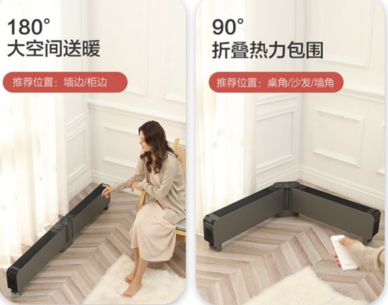 推荐理由:这款踢脚线取暖器可以180度随意折叠,好处就是各种场合都适用,展开180度的送热空间更大。