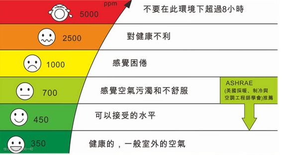 PPM在1000左右的时候,人就会闷,注意力不集中,大大影响生活效率。如果室内二氧化碳含量达到1500PPM左右,那人会感受到气喘、胸闷、眩晕。