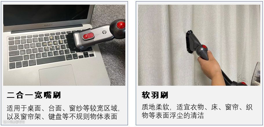 二合一宽嘴刷,适用于桌面、台面、窗纱等较宽区域,以及窗帘架、键盘等不规则物体表面清洁使用: