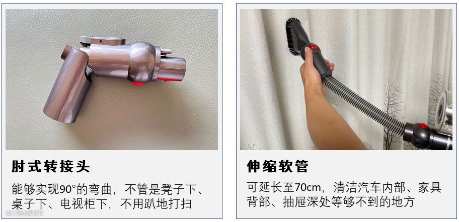 小狗T22 Pro Rinse长续航吸尘器增加了一个全新的肘式转接头,配合延长管,可以让旋转擦地刷、软绒滚筒地刷等能更顺利够到沙发底、床底等各种卫生死角,再也不用弯腰不用蹲下那么辛苦。