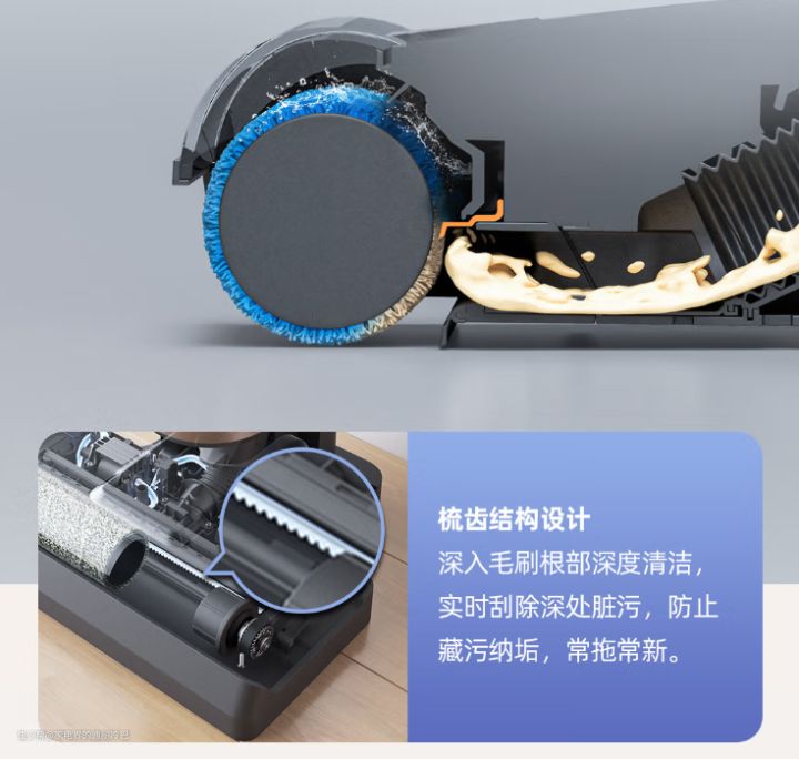 除去滚刷刷头,目前也有履带式、无滚布刷头设计。 不过这两种刷头类型的产品属于少数,履带式代表产品就是米家的无线履带洗地机了,它的优势是减少头发缠绕的情况,并且滚刷与地面接触面积大,清洁效率也高一些。