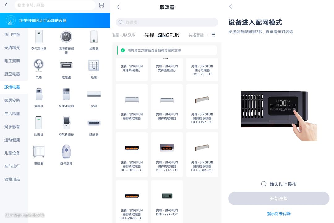通过扫码下载天猫精灵APP,开启WiFi、蓝牙、定位的设置下,进入添加设备绑定先锋暖立方取暖器。同时先锋暖立方取暖器要长按3秒配网功能,即可进行配对连接。