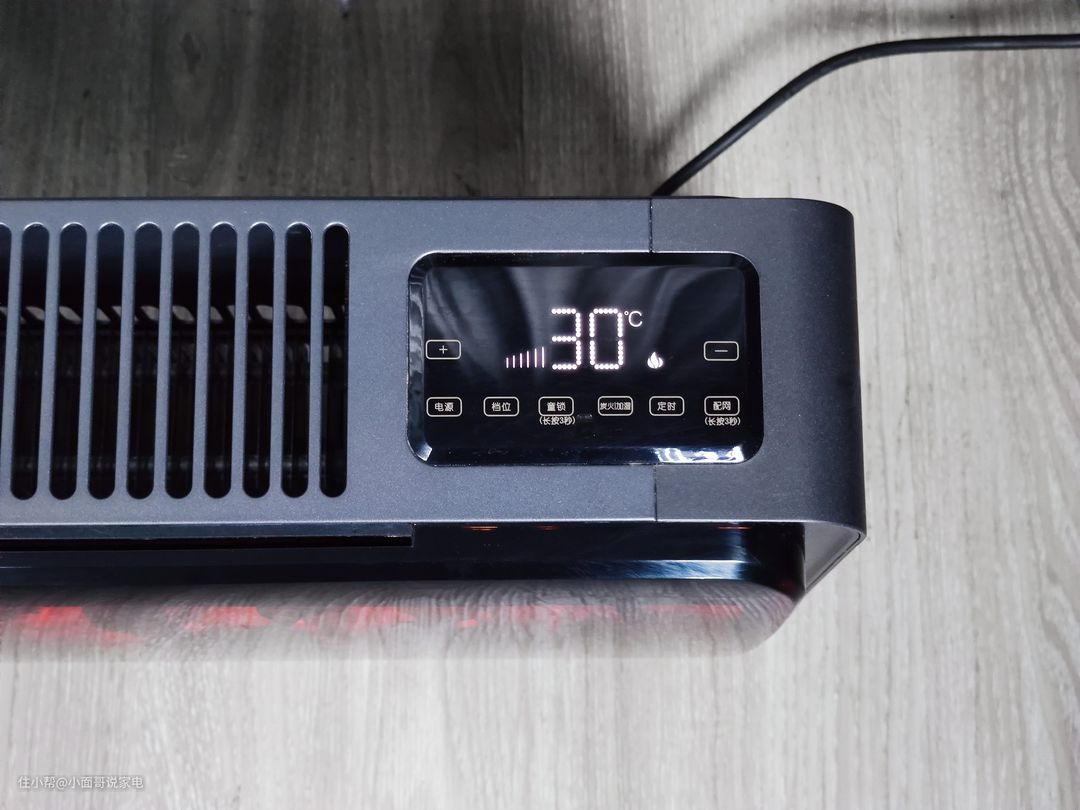 顶部右侧则是先锋暖立方取暖器的操控面板了,简单看其操控面板,可以调整制热档位、制热温度、功能模式等。主要支持童锁、炭火/加湿、定时、配网四大功能,定时和配网就不说多了,从字面意思也知道它的功能。