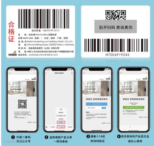 第二真百隆、真海蒂诗每个都是可以查的,方法是微信搜索“Blum百隆”或者“德国海蒂诗五金配件”公众号,进入公众号主页有“防伪查询”这个按钮,能查到就是真的。