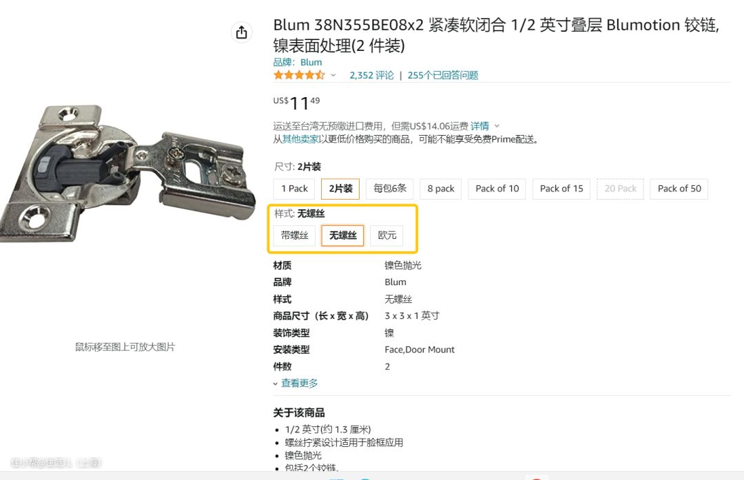 直接刷到详情页看产品的“铰杯厚度、铰杯直径、门边距(门覆盖距离)、建议门厚”四个关键词,至少有3个。