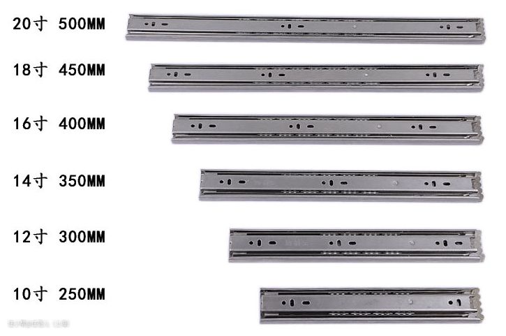 导轨分为侧托和下托的,就是导轨在侧面安装或者下面安装,分为三节的、两节的,三节的抽屉可以完全拉出,二节的只能拉出一半;