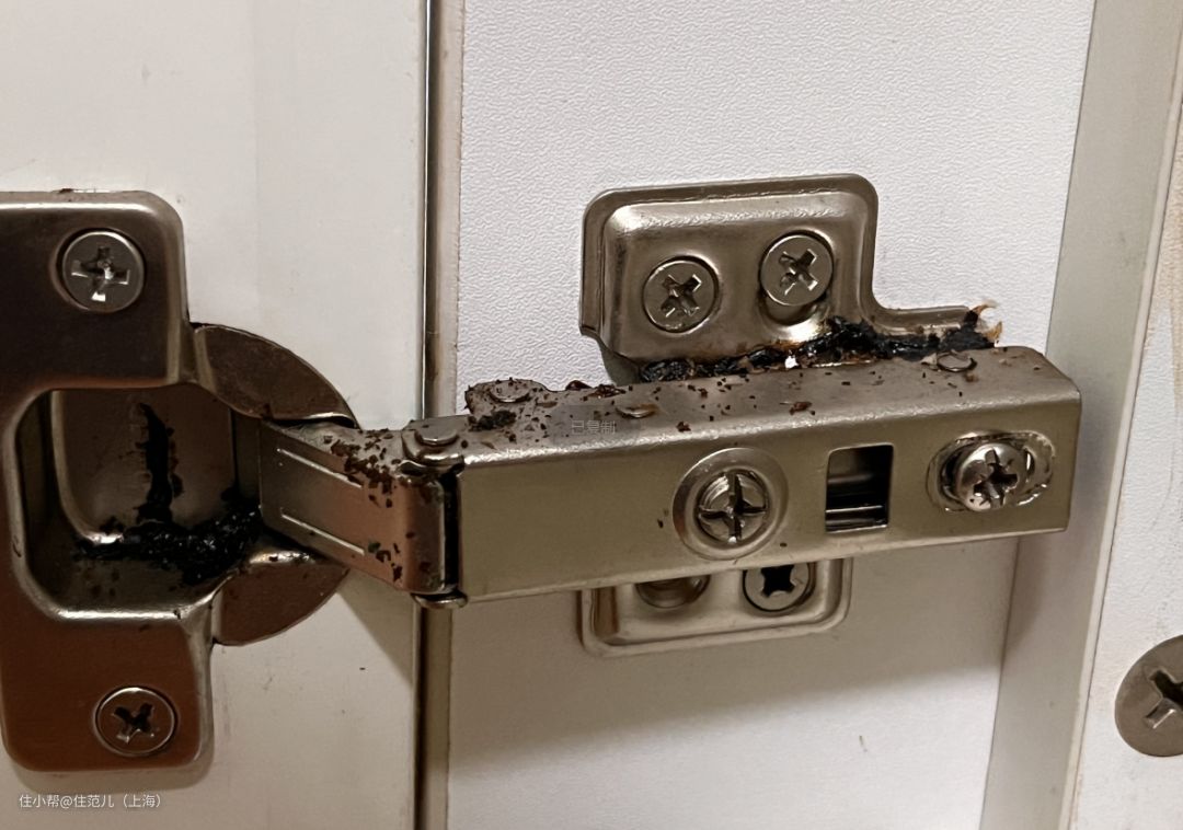 当我打开橱柜洗手池下面的柜门,属实被惊到了——柜门铰链附近怎么这么脏?