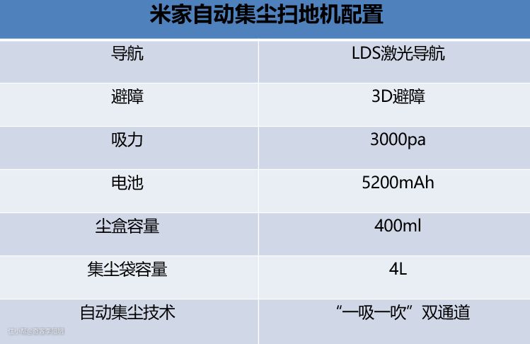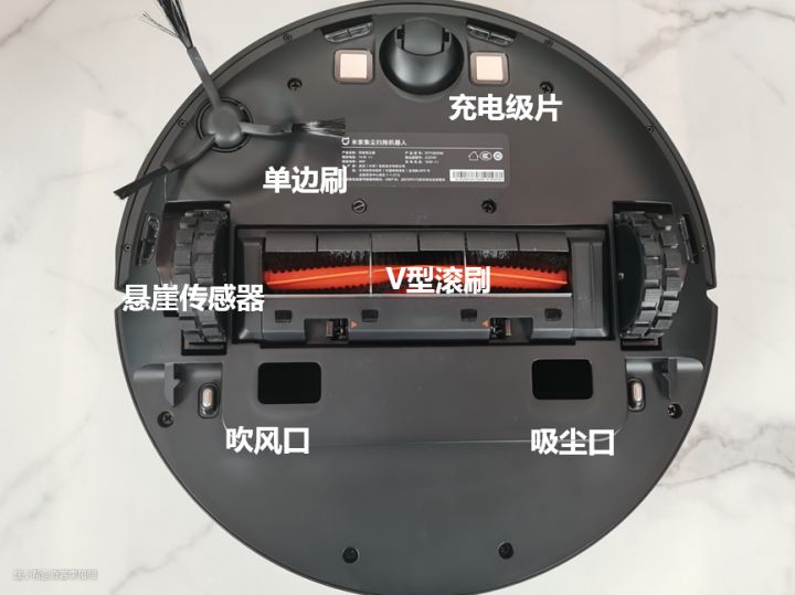 米家自动集尘扫地机清洁系统配备=V型滚刷+单边刷+充电级片+4个悬崖传感器、比其他扫地机少了2个悬崖传感器、多了一个吹风口、其他配置都是一样的。