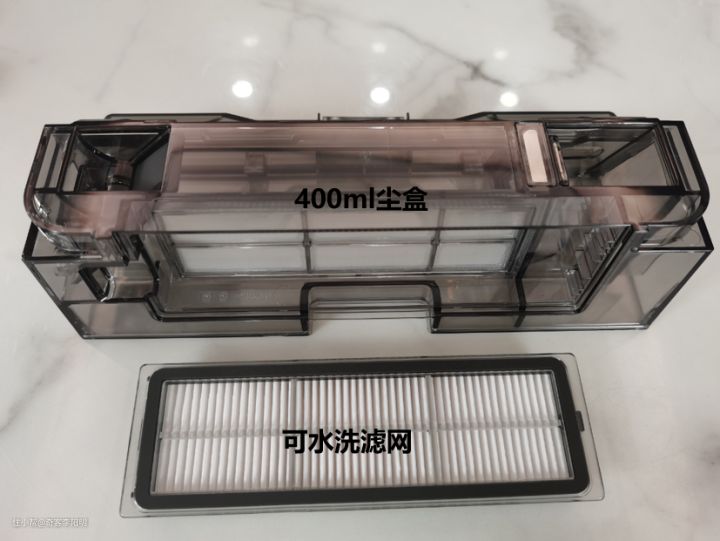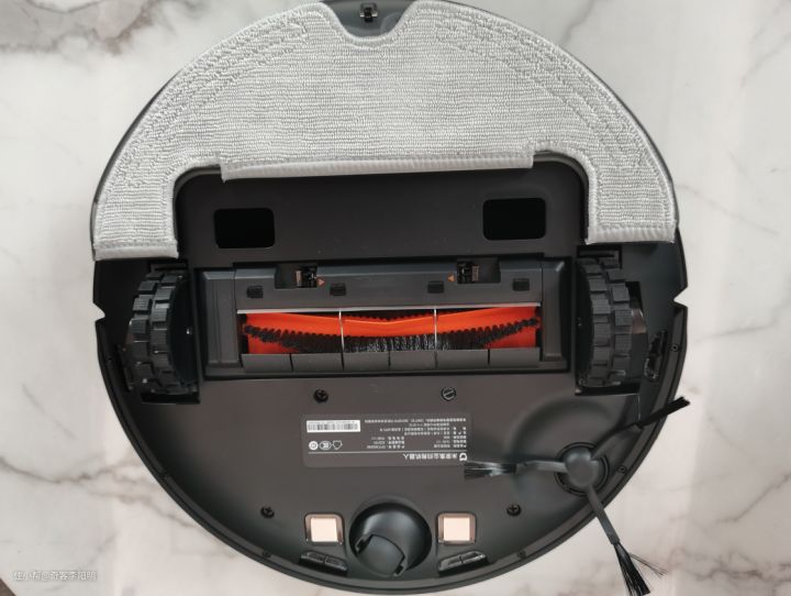 可水洗拖布上方是扫地机的拖布板块、配置的是150ml电控水箱、这个水箱容量偏小、也侧面说明这款扫地机主打的是扫地和自动集尘。