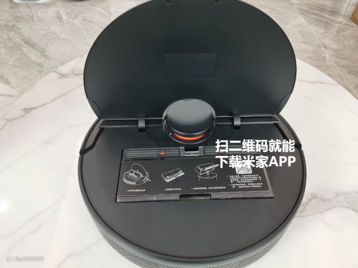 打开面板、可以看见一个简易版的操作指南和二维码、扫码就能下载“米家APP”了、值得一提的是:扫码后就能识别到扫地机器人和型号。
