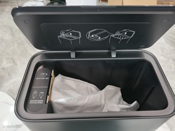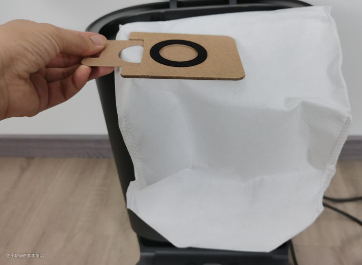 打开自动集尘站面板、是一个4L的一次性集尘袋。官方给的数据是45天不倒垃圾、这其实是在理想的实验室情况下的。具体的使用时间依实际情况而定。