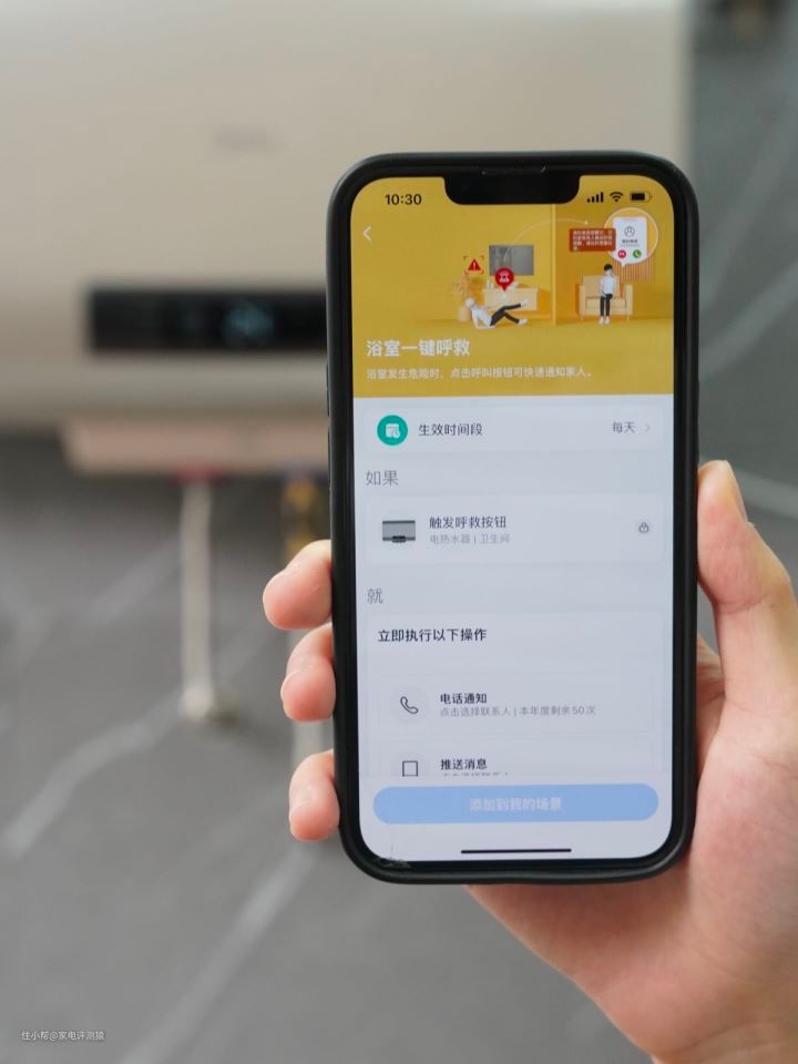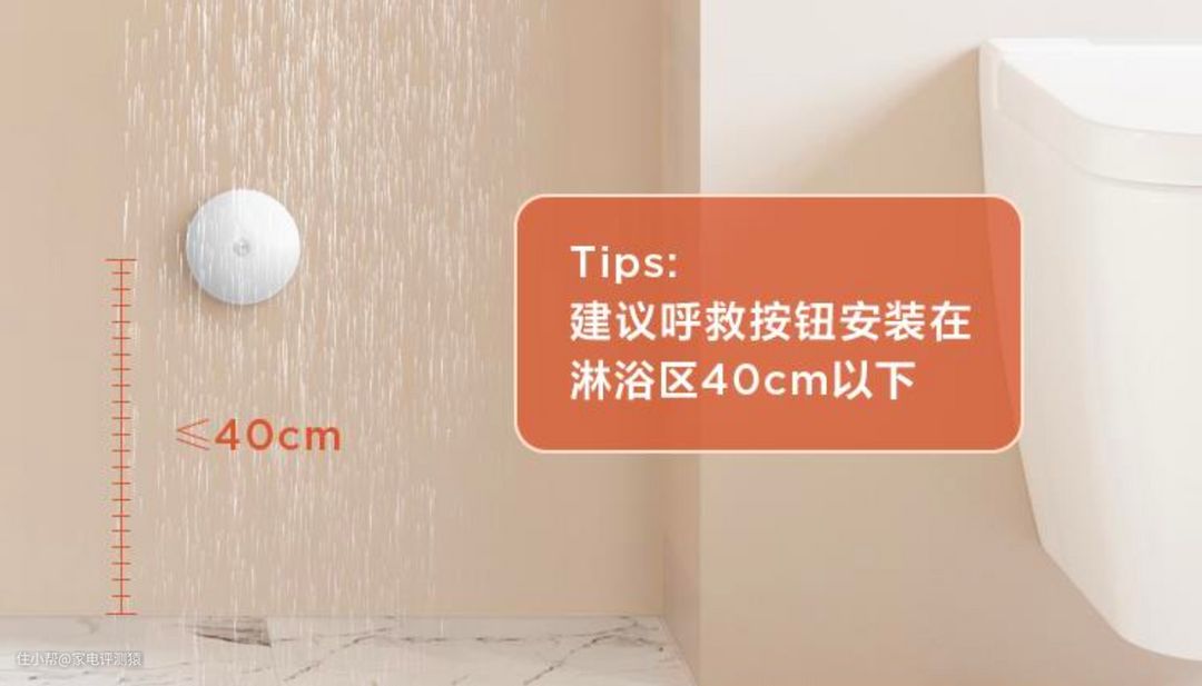 这款热水器配置了一个一键呼救装置,我们家是安装在离地面大概40cm的地方,这个高度即使趴在地上也能轻松按到。