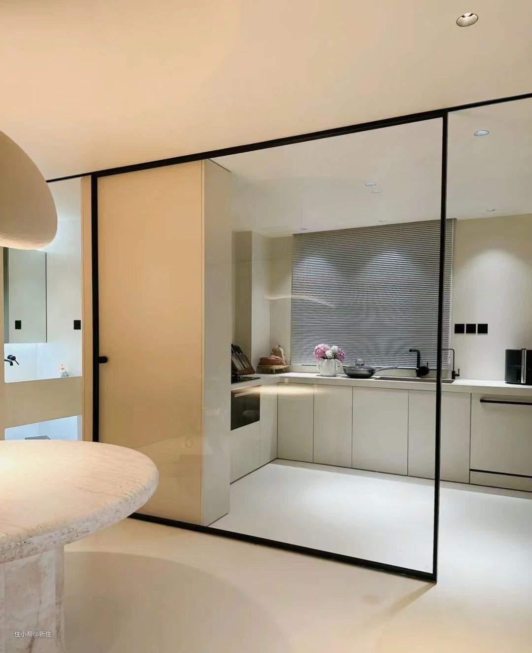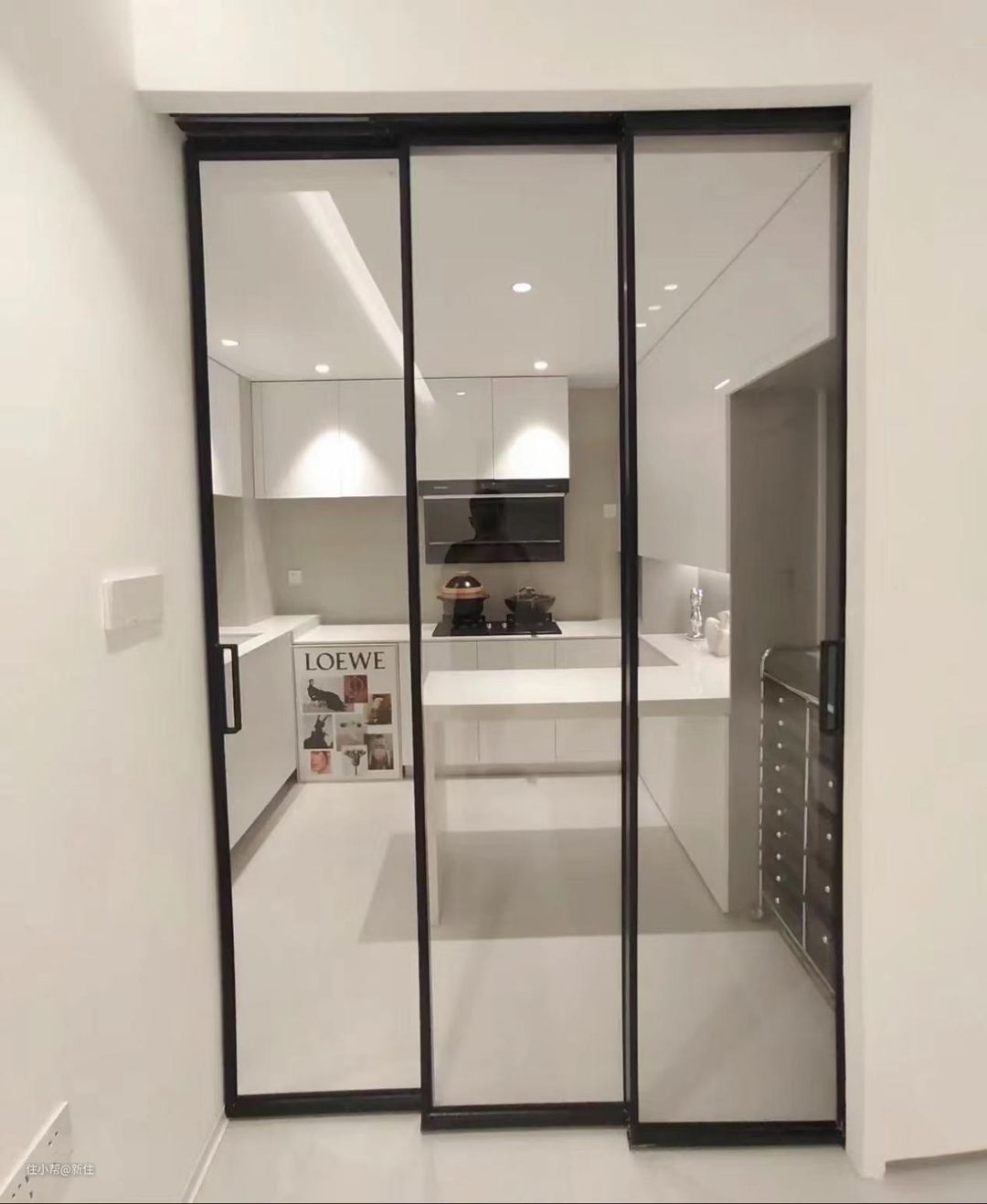 如果加上口袋门的设计,就能做成单轨双向口袋门,关上可以阻挡油烟,开启时,门几乎能达到完全隐形的状态。