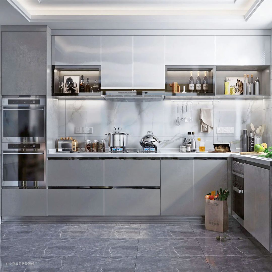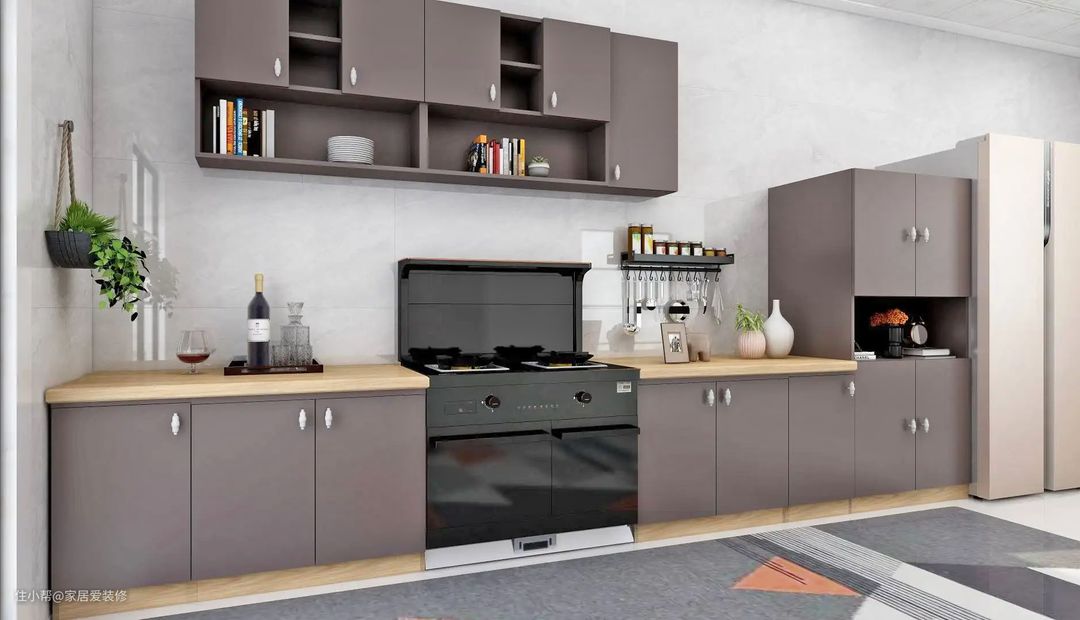 任何凸出来的地方都可能藏油烟,所以吊柜可以不用做把手,直接把柜门向下延长1-2公分,开门的时候直接拉最下面的柜门即可。