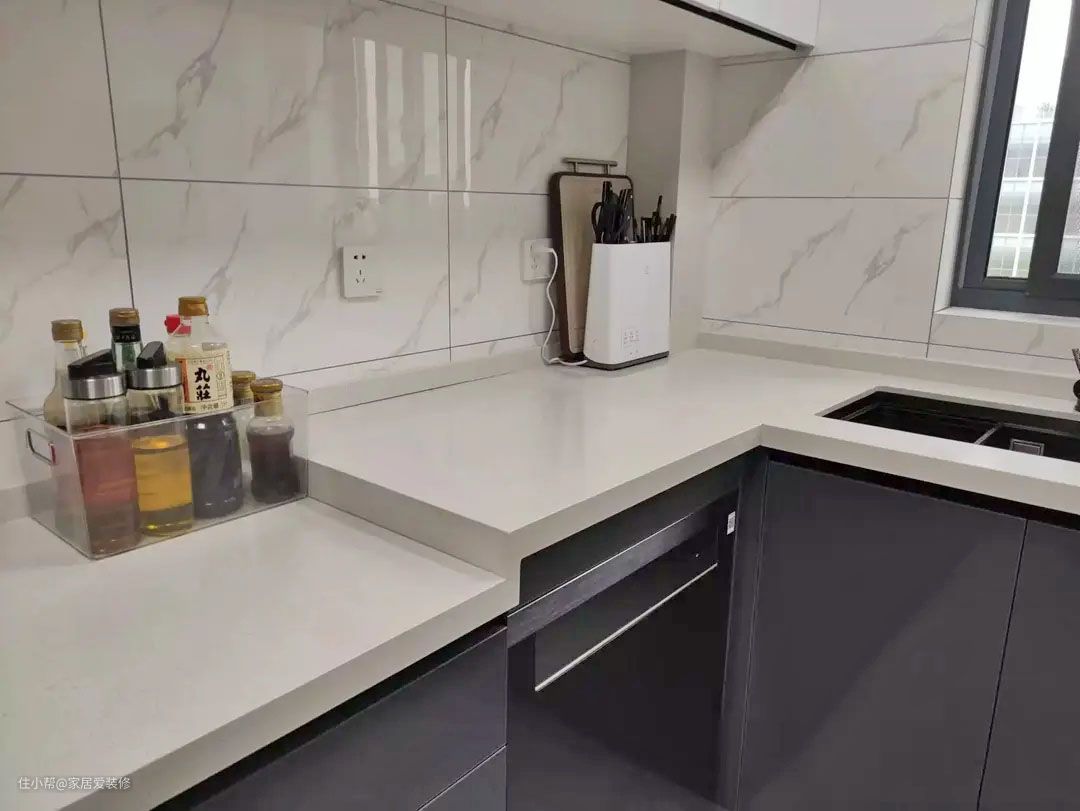 一般水槽台面高度90公分左右,灶台台面高度80公分左右。如果家里水槽台面和灶台台面正好是L型的,是非常适合这样装修的。当然,直线型的也未尝不可这样尝试。