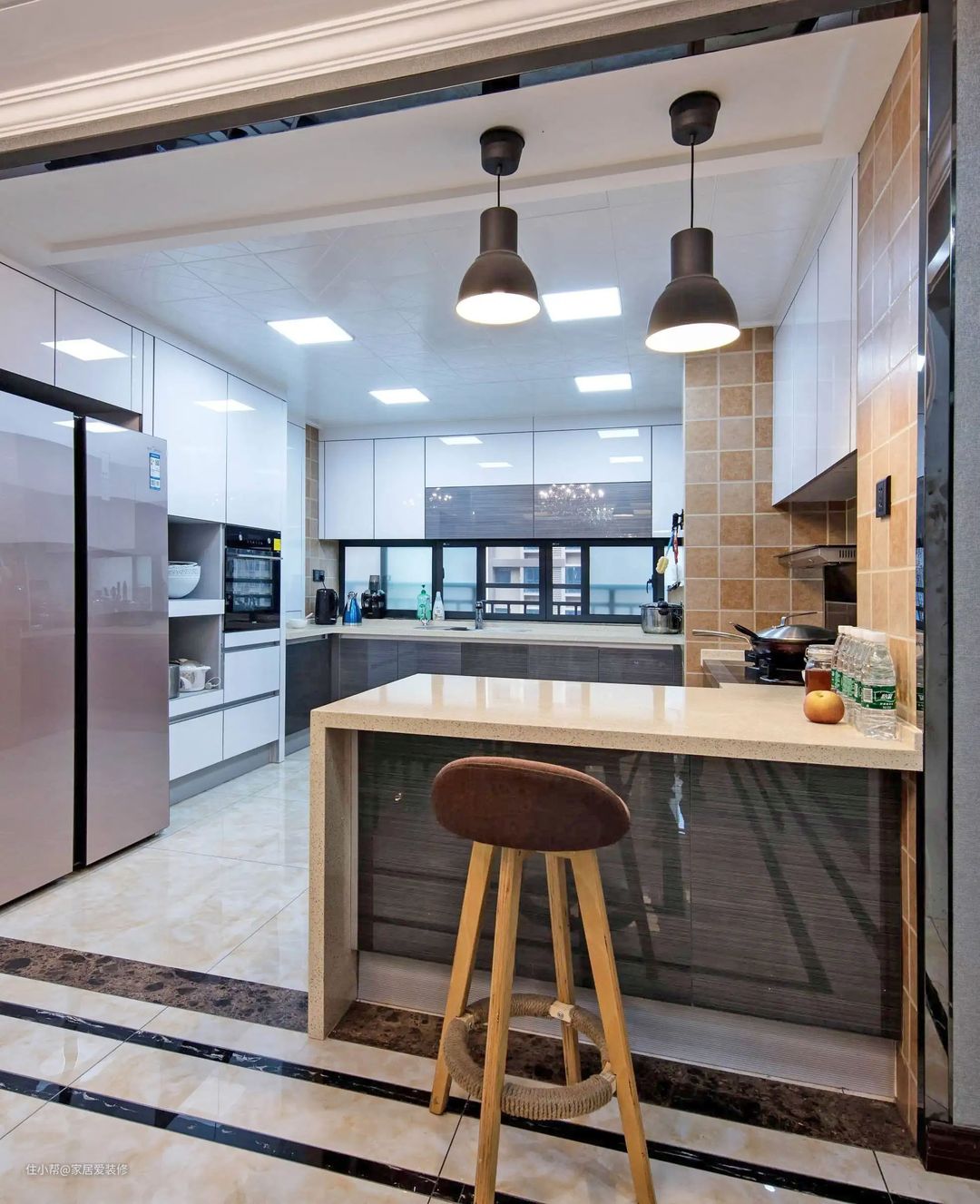 开放式厨房,吧台不能少,一般高度100公分左右。需要注意的是,吧台一定要留出来悬空空间(也就是放腿的空间),如果仅仅是一个100公分高的台面,下面都是橱柜的话,你会发现后期即便是放了个凳子,也是装饰,因为腿没地方放!