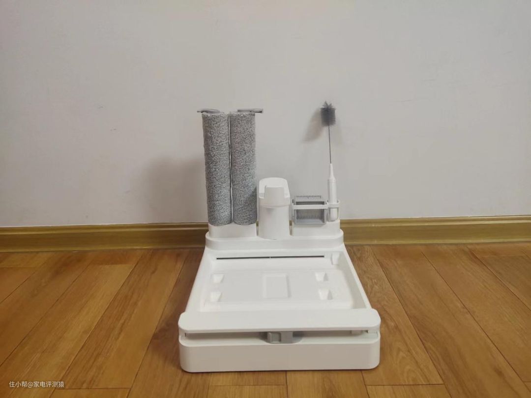 最后再来看下它的充电底座,除了安放主机和给主机充电外,还有一些收纳方面的设计,可以用于存放两个滚轮、清洁刷、滤网等配件,不用担心这些小件配件乱放后面找不到的问题哈~