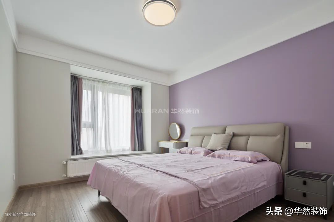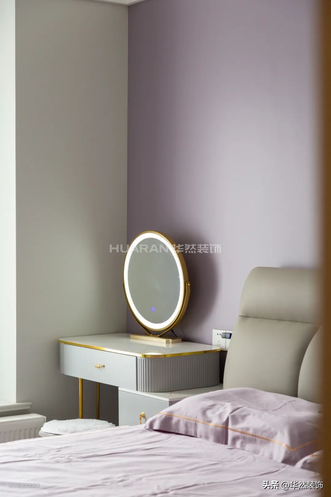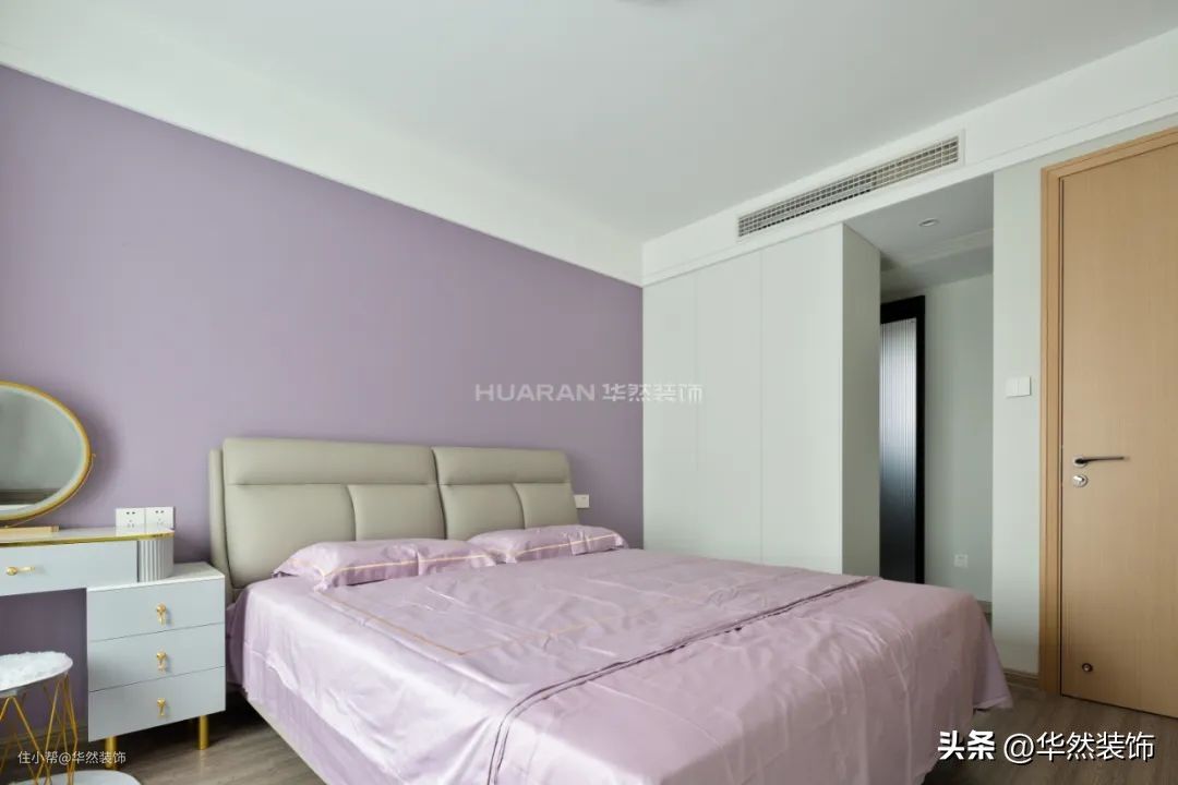 主卧进行了套间设计,包含睡眠区,衣帽间,卫生间,满足功能需求。背景墙墙面用大面积紫色上墙,与窗帘色调保持一致,墙角梳妆台的添置满足女业主日常化妆需求,光线充足,动线合理,节约时间。