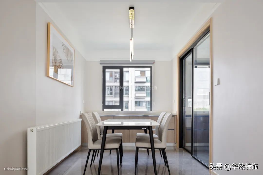 餐厅厨房光线十足,靠窗区域延伸一排定制柜,增加餐厅区域的收纳空间,餐桌选用的长方形的4人座,满足3口之家的日常使用。装饰画的加入让墙面的元素更加丰富,暖气片的加持,让就餐环境更加的温馨。