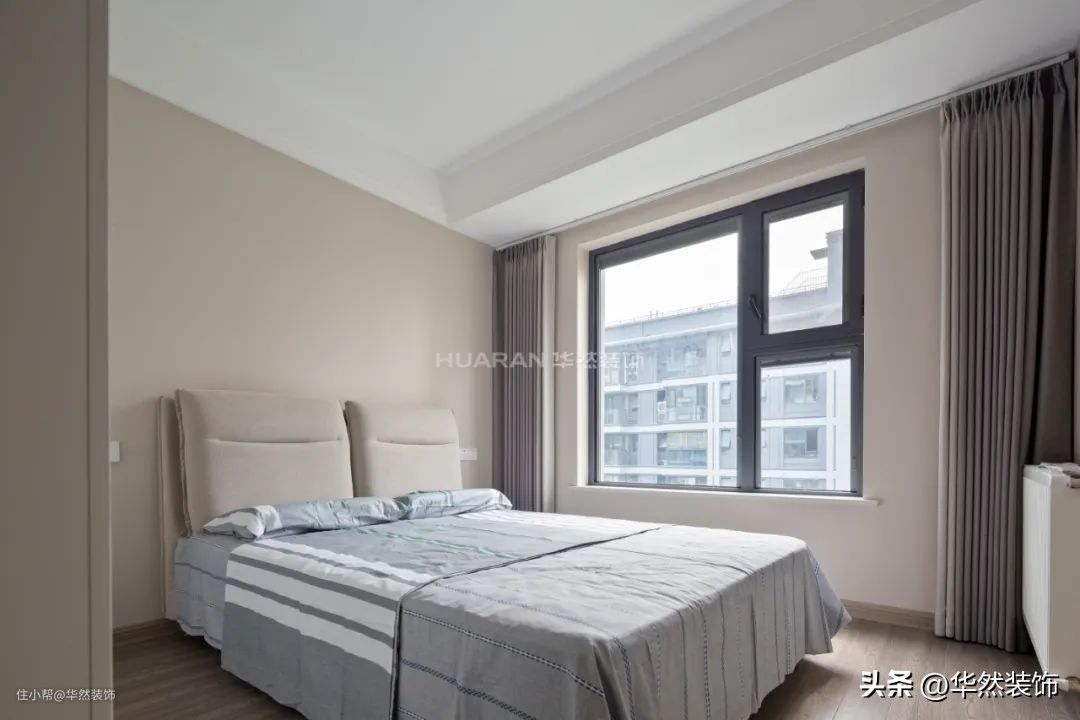 次卧的整体搭配简单素雅,床头背景墙,床,窗帘多以米色调为主,搭配灰色系,尽显高级感。