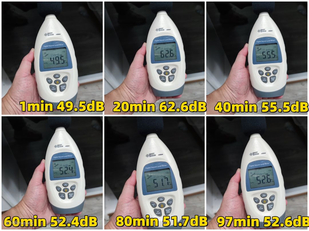 最后简单测试一下它的噪音表现。我这次的噪音测试,主要是在其洗涤过程中,每15分钟进行一次测试,具体噪音测试的结果如下: