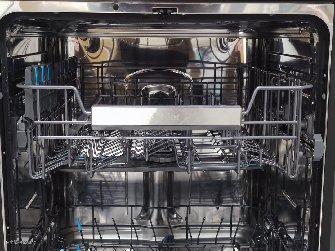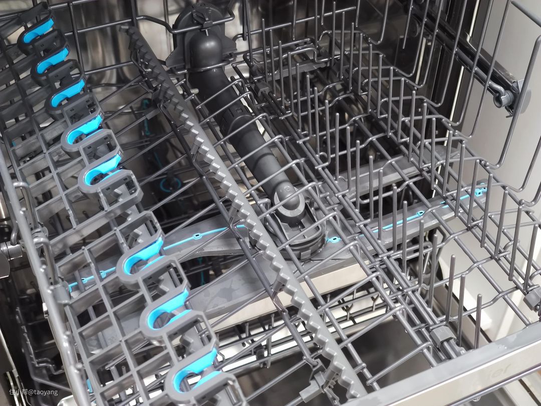 这里着重说说海尔W5000中间那个喷淋臂,一般中间喷淋臂都是“一”字型设计,这种设计方案一般智能朝上喷淋,不能朝下喷淋。如果洗锅的时候,锅朝下放置,锅的底部往往不能得到很好地清洁。