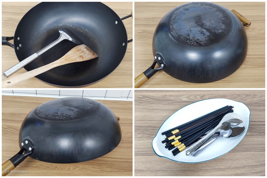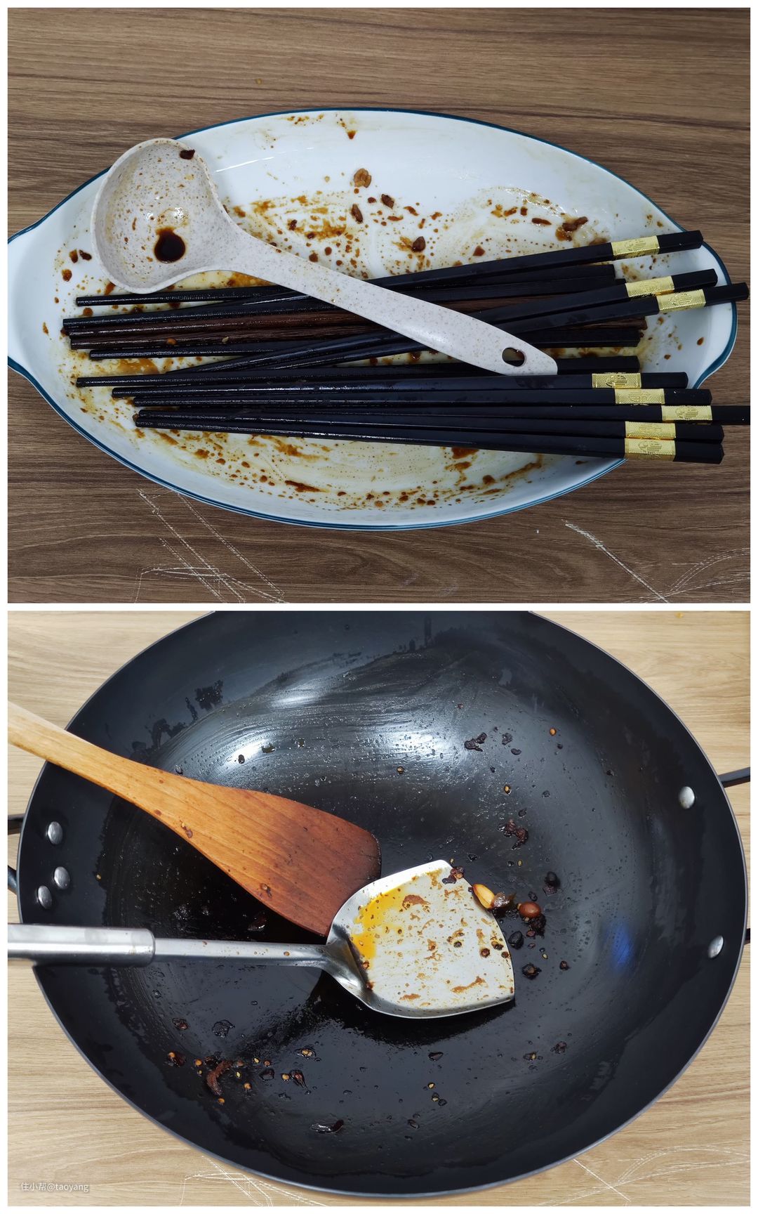 从图中可以明显看出,锅内还有一堆残留的油渍、污垢,加上我平时还喜欢木锅铲、不锈钢锅铲混着用,满是油垢的锅具洗起来还是很费劲的。
