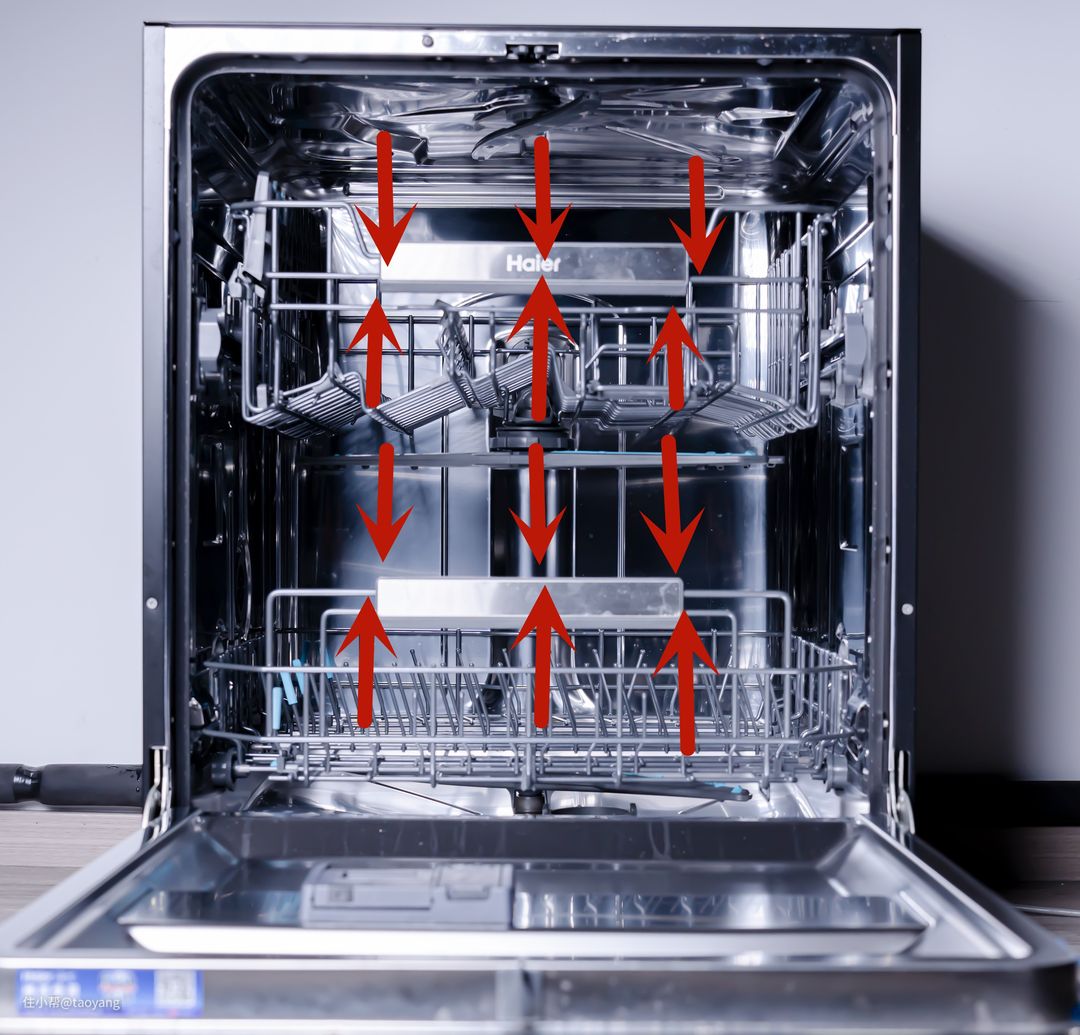 而海尔W5000中间的喷淋臂采用了H形设计,既可以朝上喷淋,也可以同时朝下喷淋,对餐具的洗涤可以做到全面覆盖。