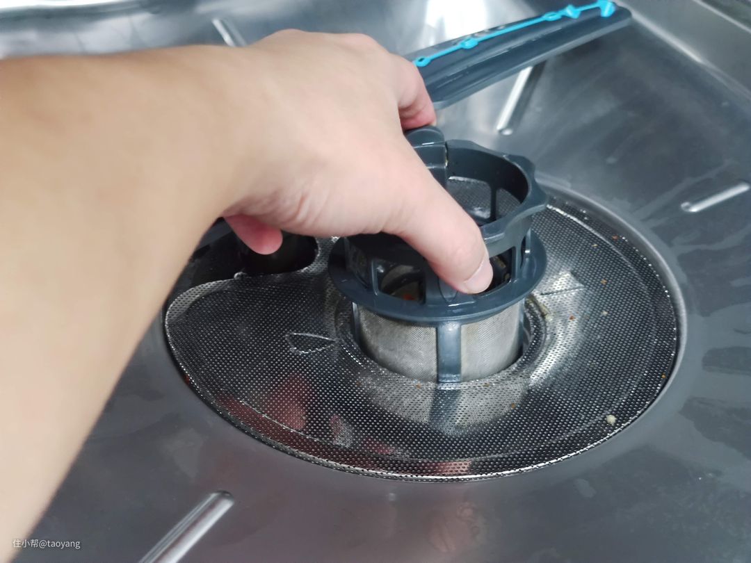 滤网则是在机身内胆底部,只要将下碗篮抽出,通过旋钮的方式即可将滤网取出。建议平时洗涤完毕之后,定期清理滤网。