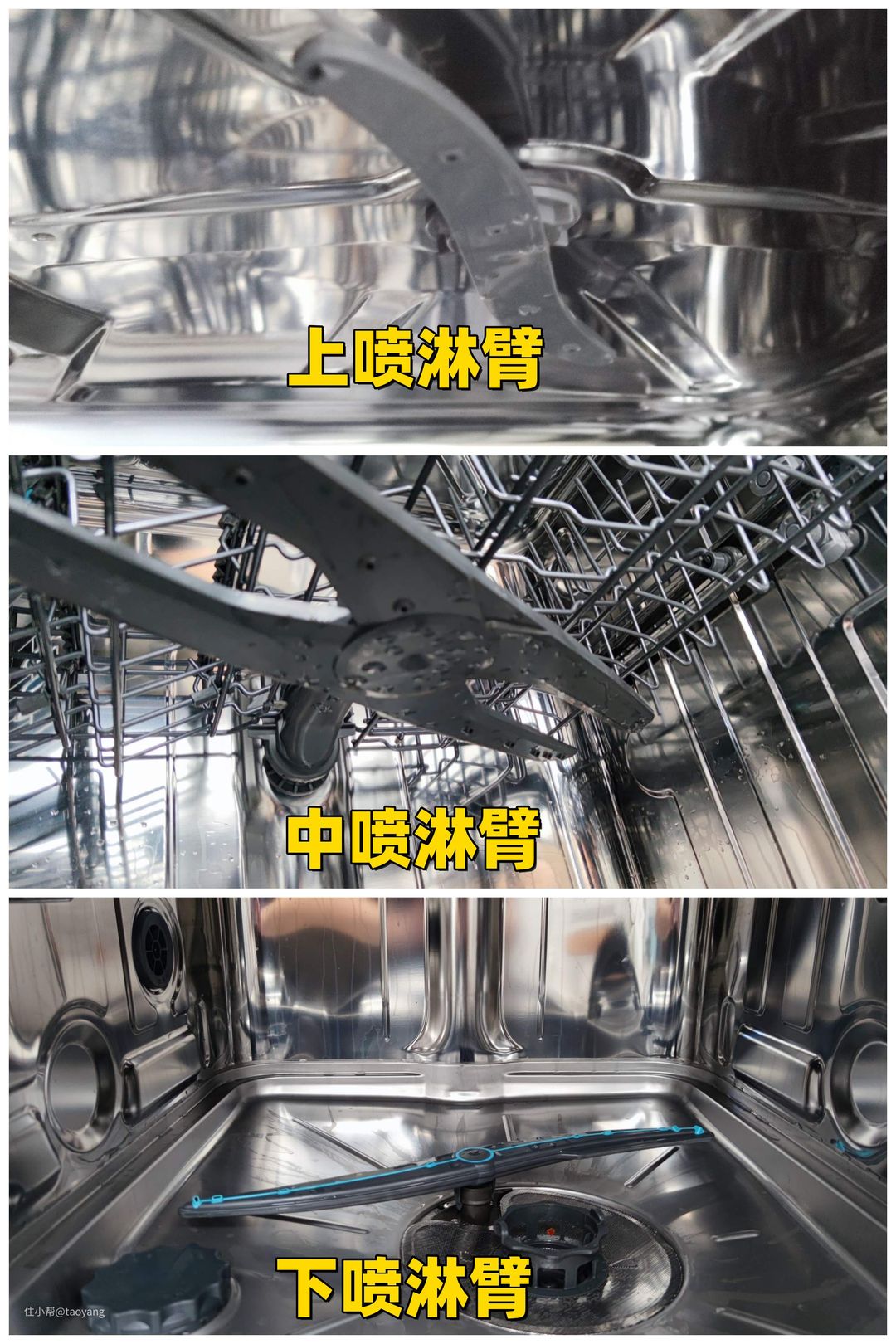 它一共有三个喷淋臂,分布在上中下三个位置。得益于三个喷淋臂的设计,所以它是支持上下分区洗功能,餐具数量不多的情况下,使用分区洗,可以很好地做到节能节水。