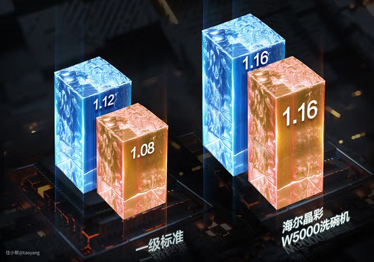 这里顺带科普一下,关于洗碗机,国家一级水效标准是需要达到1.12的清洁指数,1.08的干燥指数;而海尔W5000的清洁指数和干燥指数,都是1.16,完全超过了国家一级水效的标准。