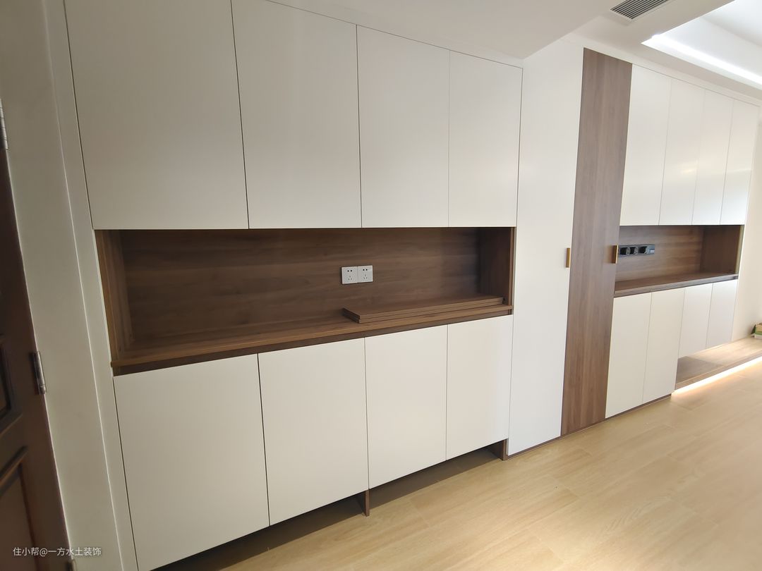 玄关柜连接餐边柜,大大增加使用效率一方水土装饰2022-12-14入户过了玄关之后就是餐厅了,餐厅的餐边柜连接玄关柜,看起来会不会更整洁呢?玄关柜与餐边柜都选择中间留空,用不同的颜色作为间隔。这里选择了奶白色与棕色相结合,巧妙搭配,妥妥奶油风。大面积的柜子,完全不用担心收纳空间不够啦~还不容易落灰,更方便打理哦~
