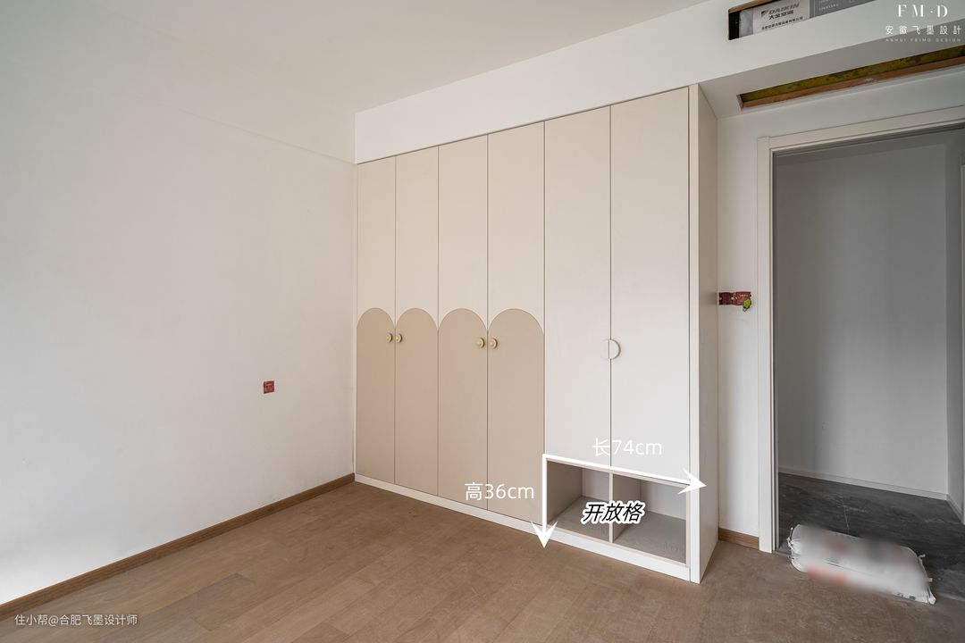 【绿城玉兰公寓】这家儿童房衣柜设计也很有创意,门板除了做拱形+分色漆设计,右侧底部还留了2排开放格,长74cm,高36cm,用来塞收纳盒存放乐高玩具等小物件,也是好看好用。
