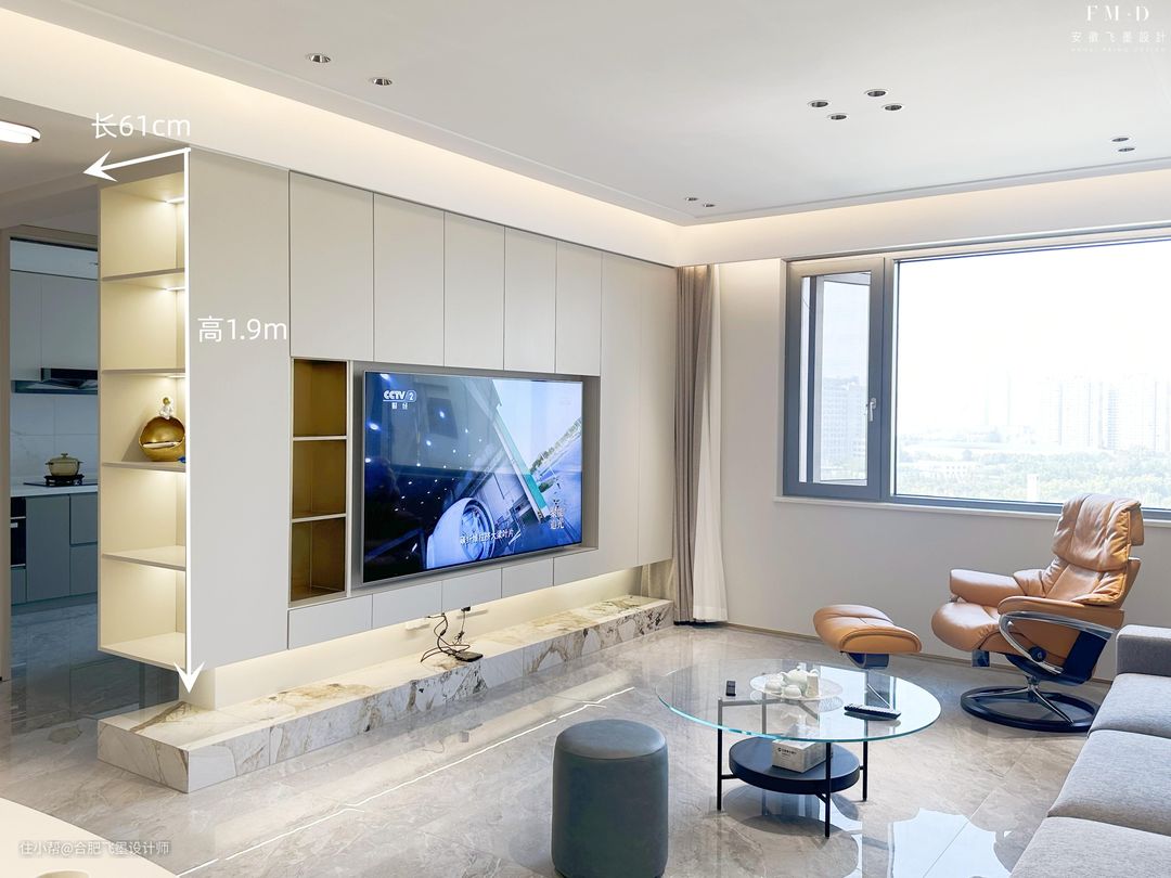 或者学【天鹅湖畔】这家,将开放格装在电视柜侧边,长61cm,高1.9m,凸显层次感,双面收纳,也满足多样性的储物需求。