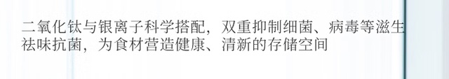 银离子抗菌的升级版,在光触媒作用下装置双重释放二氧化钛和银离子,吸附并分解冰箱内的细菌和异味分子,杀菌除臭,抗菌率达99%。