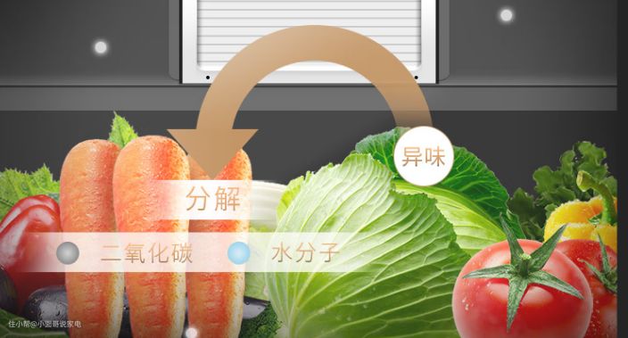通过向冰箱内空气中的水微粒施加高压产生纳米级离子,其中含有大量烃基自由基,可以吸附在细菌表面并消灭细菌,带走细菌中的氢元素,结合生成水,细菌被分解,从而达到杀菌去异味的作用。