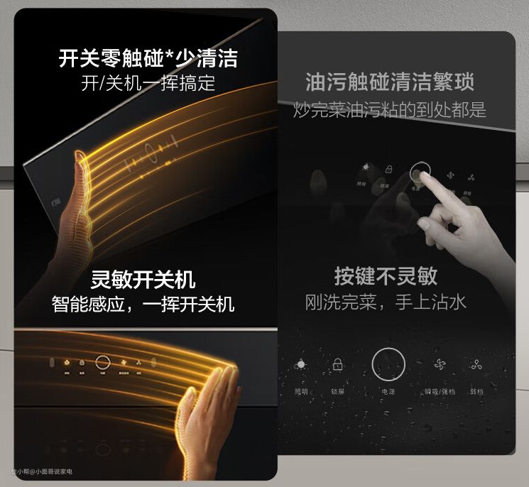 智能方面:零碰触设计,挥手智控,可有效保证面板洁净和后期清洁的麻烦;
