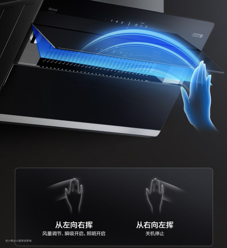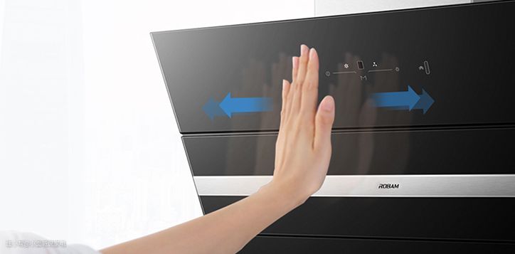 智能方面:利用红外感应器,实现隔空手势操控,挥手就可控制风机开关和风量大小,可轻松避免油污于烟机的接触。