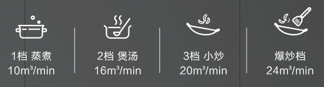 吸烟能力:搭配直流变电机,配合4档风量设计,爆炒模式下瞬吸可达24m³/min,可实现爆炒速排