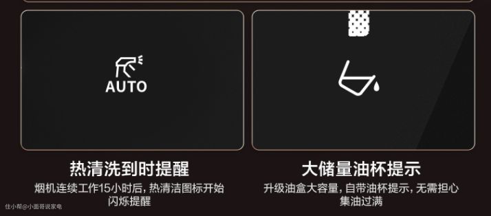 这里说的双重监测提醒,就完美的解决了这一问题,油烟机的风机运行15个小时后,屏幕上就会自动亮起清洁图标,提示需要清洁油烟机和油杯,然后再进行自清洁操作和清理油杯工作即可,既方便又省心。