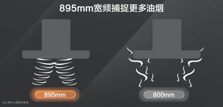 拢烟能力:895mm宽域拢烟搭配隔烟飞翼,近距离高效强拢油烟,能够有效防止溢烟跑烟;
