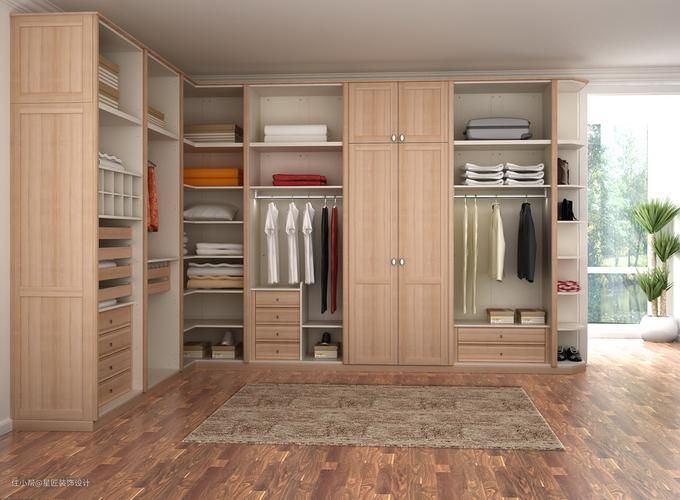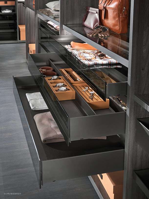建议一般衣橱储物架设置在最上层或最下层,这样衣橱可以架上多点收纳箱,这样就可以节省日常使用的空间,中间便有更多空间展示衣物。
