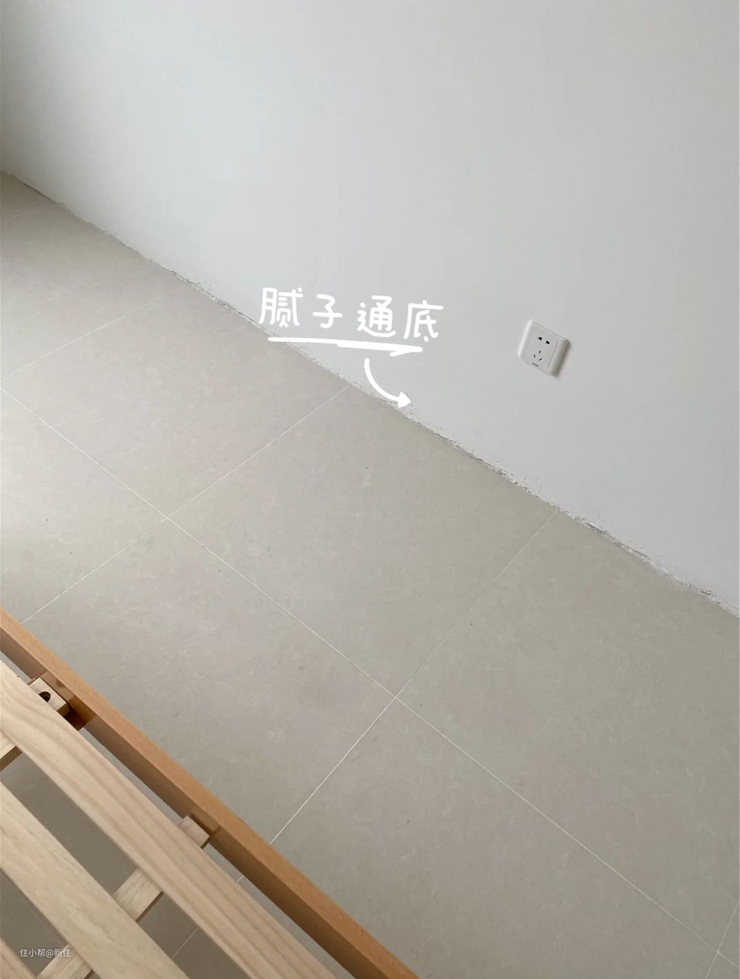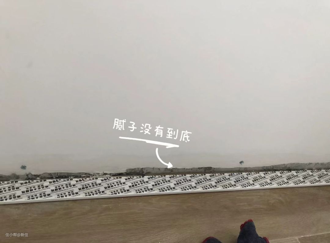 这个主要牵扯到踢脚线的安装,一般的腻子都不会批到底,而是像下图的样子,会留一点点边。
