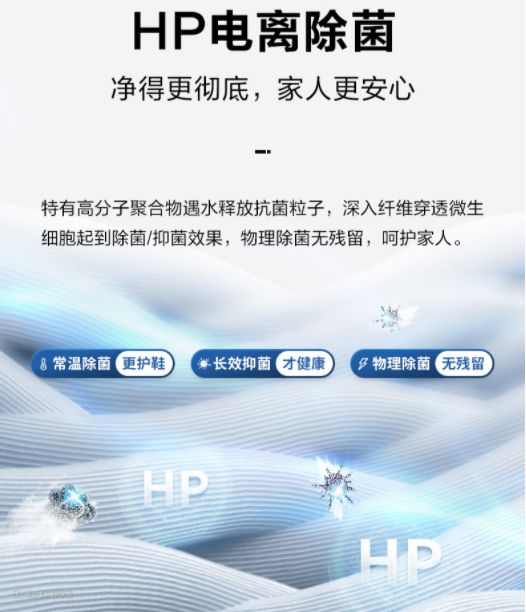 HP电解除菌:在内筒中带有特有的高分子聚合物,在遇到水后会释放抗菌因子,可以深入至鞋物的纤维中,可以做到深层次除菌,除菌率达99.99%。