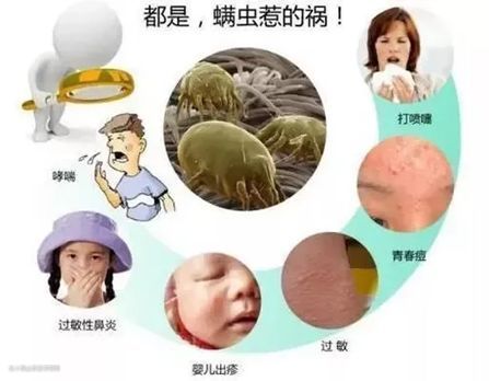 它们的分泌物、排泄物会使我们脸上的爆长了不少粉刺痘痘、背上还会出现了许多小疙瘩…以及鼻炎、痤疮、哮喘、毛囊炎等疾病的产生都和螨虫有关系,所以为了家人和自己的健康,除螨刻不容缓!