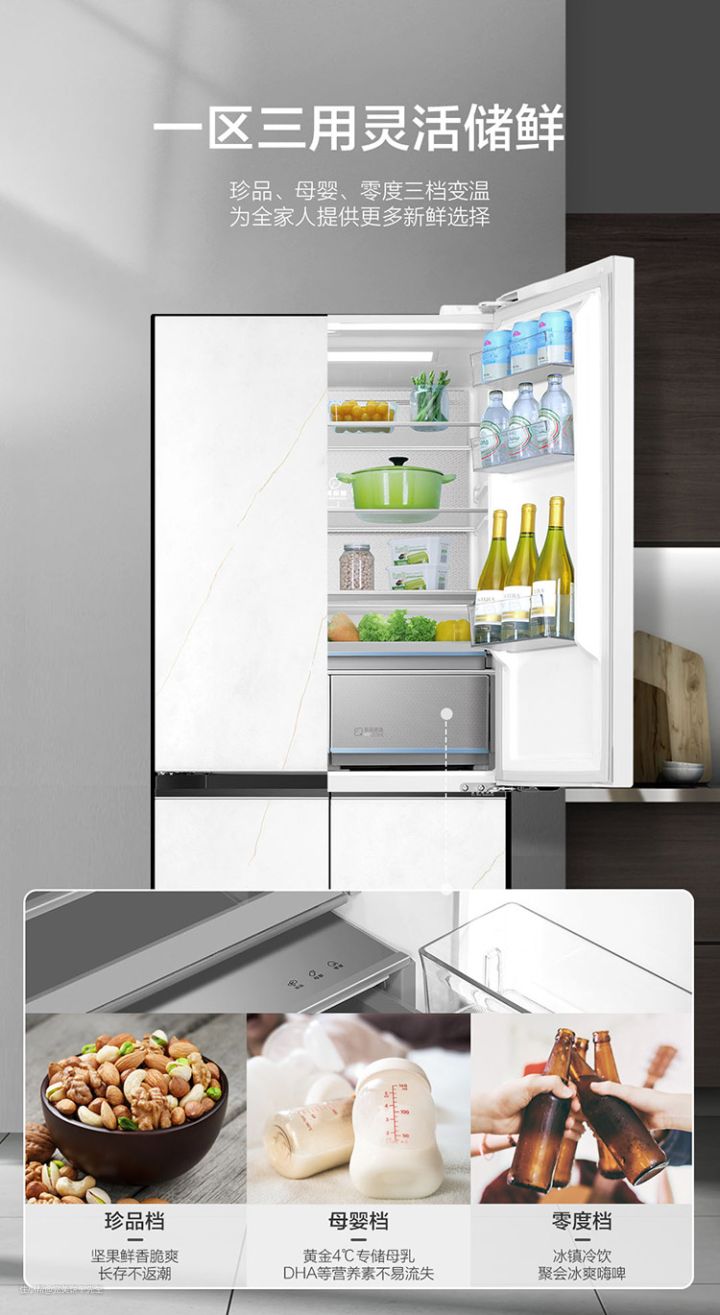其中冷藏室主要是通过干湿分储,实现保鲜;而冷冻室则是通过智能恒温技术,控温精准,温度波动小,保证了食物的营养与口感。右侧设立变温区5℃~-20℃区间都可调,可以为不同的食材设置不同的定制温度,冷藏冷冻随意切换。
