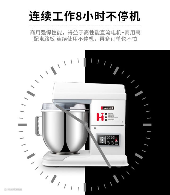 亮点是可以提供点动功能,容量大,重量也重,8.3kg,相对来说机子也更加稳定。 交流电机 1200W功率,噪音比较小,标72分贝,但我感觉比HM740噪音更小。 电子显示屏,可以自动调整时间长短。非常不错的一款厨师机