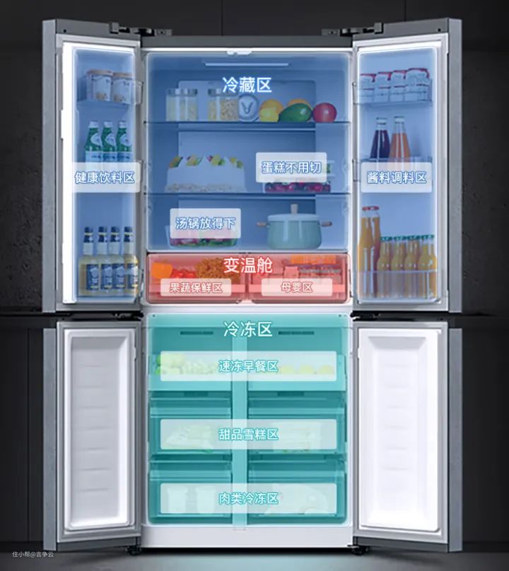 而且除了冷藏冷冻区外,还有变温区,干湿分储区,能够满足不同食材储存要求,所以相对来说十字门冰箱的空间布局更加合理。